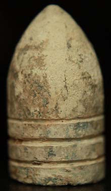 For your consideration one McKee & Mason 410 machined ring Civil War bullet with 3 widely spaced rings. You will find this bullet to be in excellent dug condition. The patina is a choice white on brown colors & I do not see a single patina chip. Notice the pointed nose & a nose cap ring. The cavity is ellipsoidal. Measures about 0.545 x 0.98 inches. Dug from the Corinth - Shiloh area. See all 4 photos.