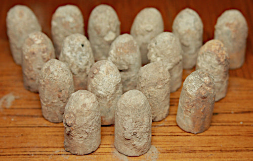 For your consideration 17 Enfield bullets found from a Confederate cartridge box at Kennesaw Mtn., Georgia. All bullets are uncleaned...just as found. Many have chunks of dirt still attached. All are cone cavity, rounded nose...all are exactly alike.