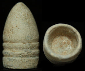 This item is SOLD For your consideration one McKee & Mason #407 For rifled musketoon-note thin rim bullet. You will find this bullet to be in very good dug condition…the best one I have seen. This item is SOLD The patina is a real nice white. Mold seams can be seen on both sides of this bullet. The cavity is a cylinder & notice the very thin skirt…as noted by M&M. Measures about 0.575 x 1.02 inches. This item is SOLD
