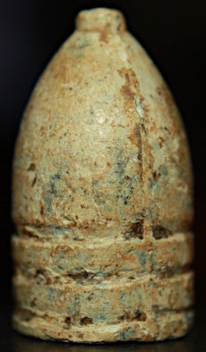 For your consideration one unlisted Confederate three ring bullet. You will find this bullet to be in excellent dug condition. The patina is a (slick-waxy) brown color & I do not see a single patina chip. Notice the extra long nose cast sprue. Heavy, protruding mold seams can be seen on both sides of this bullet. The first ring is a low base ring & all 3 grooves are shallow cast. The cavity is a cone. Measures about 0.575 x 1.015 inches. Dug from the foothills of NE Tenn - Longstreet's troops. The first winter after Gettysburg.