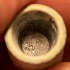 For your consideration one dot (.) 57 base marked Enfield bullet. You will find this bullet to be in excellence dug condition. The patina is a very slick, waxy white color & I do not see a single patina chip...my guess bullet was made from high quality lead. Made in England & ran the harbor blockades to see the ACW firsthand?? See Photo 3: shows an impressed line in the side of this bullet. At the arsenal when lead & paper cartridge first came together the paper is impressed into the side of the lead bullet to aid in a uniform removal of paper from lead when using the cartridge in the field. Very nice capped nose. Measures about 0.57 x 1.07 inches.